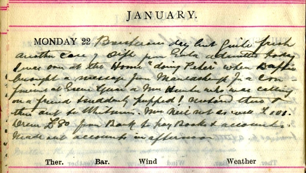 Boisterous day but quite fresh. Another case of Diph. from Gala admitted today. I was over at the Home1 “doing Peter”2 when Baptie3 brought a message from Mauldsheugh4 for a confinement at Green Square, a Mrs Hunter who was calling on a friend + suddenly pupped!5 Motored there + then out to Whitmuir. Mrs Neil not so well T.100.6 Drew £80 from Bank to pay Books + accounts. Made out accounts in afternoon.