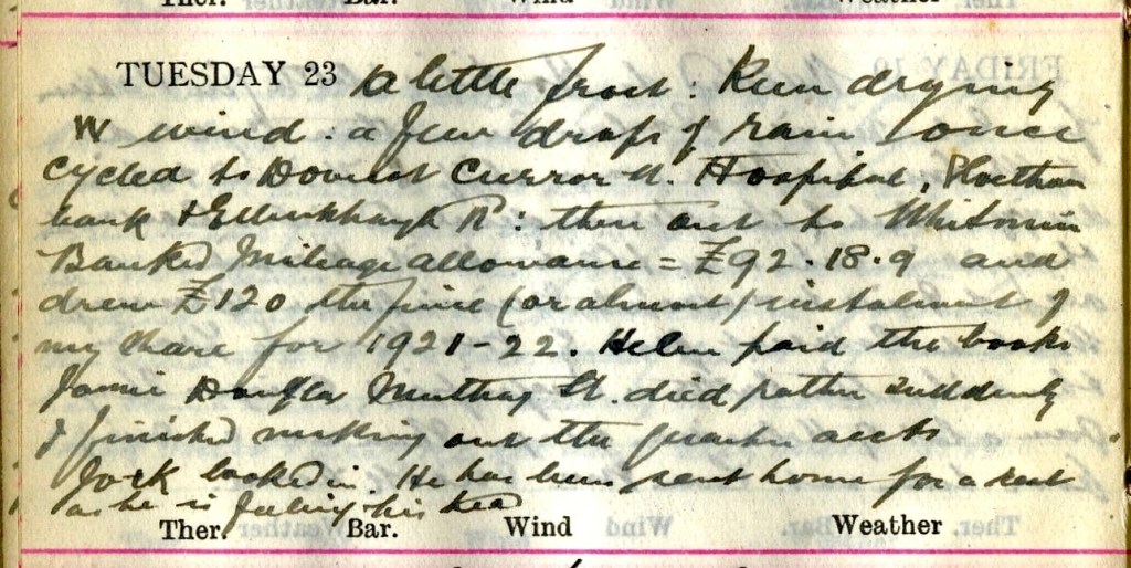 A little frost : keen drying W. wind : a few drops of rain once. Cycled to Dovecot, Curror Street, Hospital, Sloethornbank + Ettrickhaugh Road : then out to Whitmuir.1 Banked mileage allowance £92. 18. 9. and drew £120 the final (or almost) instalment of my share for 1921-22. Helen2 paid the books. Jamie Douglas, Muthag Street died rather suddenly.3 I finished making out the quarter’s accounts. Jack4 looked in. He has been sent home for a rest as he is feeling his head.