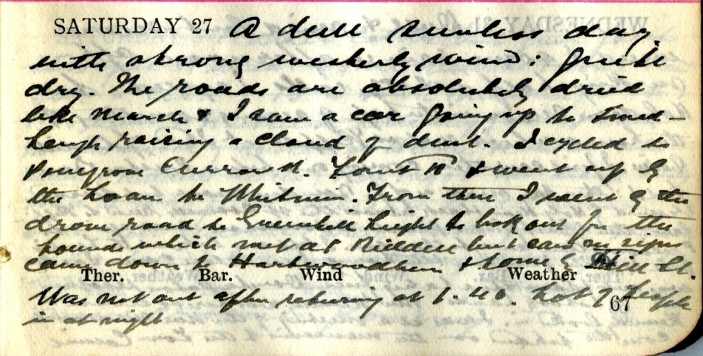 A dull sunless day with strong westerly wind : quite dry. The roads are absolutely dried like March + I saw a car going up to Smedheugh1 raising a cloud of dust. I cycled to Pinegrove + Curror Street, Forest Road + went up by the Loan to Whitmuir.2 From there I went by the drove road to Greenhill height3 to look out for the hounds which met at Riddell4 but saw no sign. Came down to Hartwoodburn + home by Mill Street.5 Was not out after returning at 1.40. Lot of people in at night.6