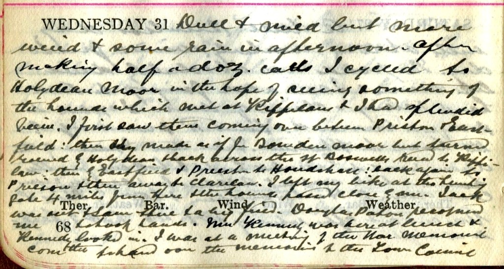 Dull + mild but more wind + some rain in afternoon. After making half a dozen calls I cycled to Holydean Moor with hope of seeing something of the hounds which met at Kippilaw1 + I had a splendid view. I first saw them coming over between Prieston + Eastfield : then they made as if for Bowden Moor but turned round by Holydean + back across the St Boswells road to Kippilaw : then by Eastfield + Prieston to Houdshall : back again by Prieston + then towards Clarilaw. I left my bike at the [hunting ?] gate 4 miles from here + the hounds passed close by me. Jack2 was out + Sam Steel3 + a big field. Douglas Paton4 recognised me + shook hands. Mrs Kennedy5 was here at lunch + Kennedy6 looked in. I was at a meeting of the War Memorial Comttee to hand over the memorial to the Town Council.7