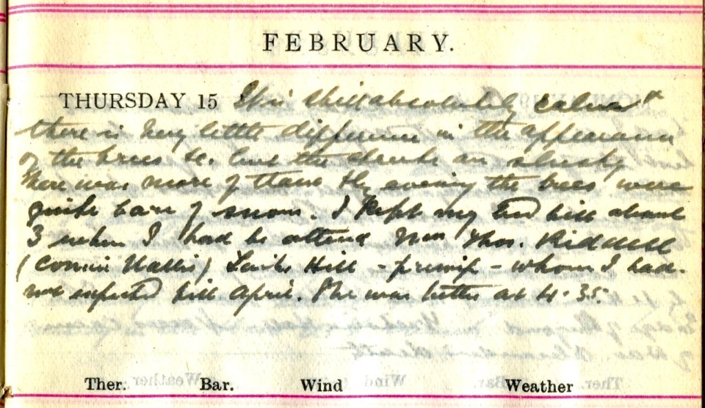 It is still absolutely calm + there is very little difference in the appearance of the trees +c but the streets are sleety. There was more of thaw + by evening the trees were quite bare of snow. I kept my bed till about 3 when I had to attend Mrs Thomas Riddell (Connie Wallis), Tait’s Hill1 – primip – whom I had not expected till April. She was better at 4.30.
