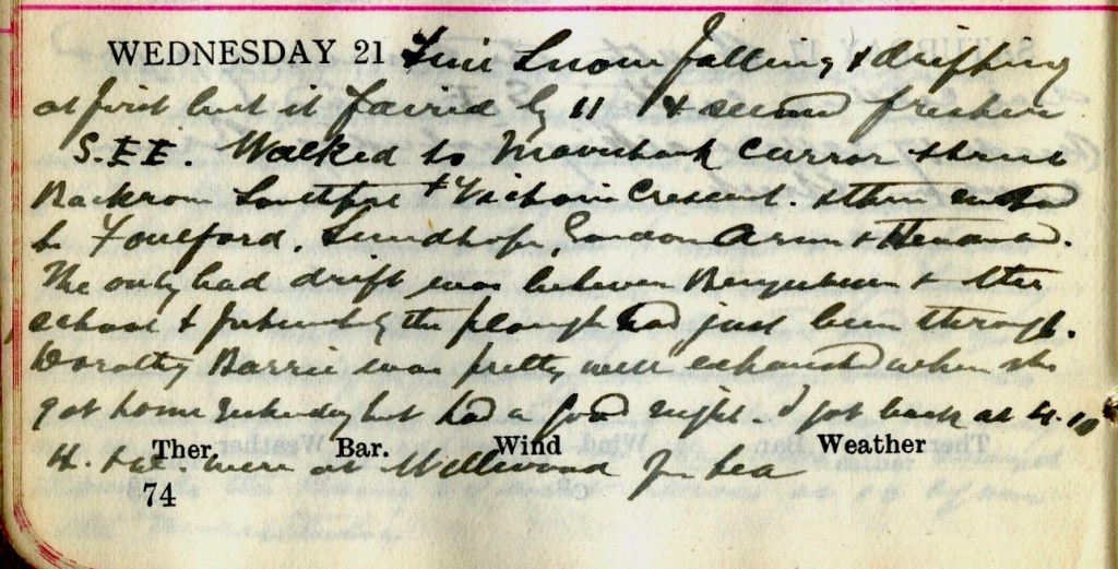 Fine snow falling + drifting at first but it faired by 11 + seemed fresher. S.S.E. [wind] Walked to Mavisbank, Curror Street, Backrow, Southport + Victoria Crescent + then motored to Foulford1, Sundhope, Gordon Arms + Henderland. The only bad drift was between Bengerburn + the school + fortunately the plough had just been through. Dorothy Barrie2 was pretty much exhausted when she got home yesterday but had a good night. I got back at 4.10. H.3 + D.4 were at Wellwood5 for tea.