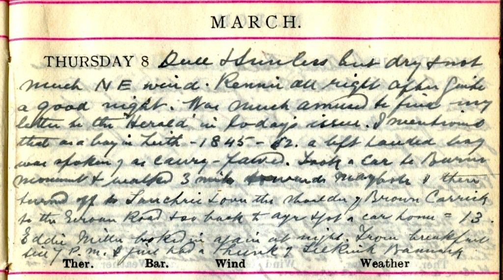 Dull + sunless but dry + not much N.E. wind. Rennie1 alright after quite a good night. Was much amused to find my letter to the Herald in today’s issue.1 I mentioned that as a boy in Leith – 1845-52 a left-handed boy was referred to as caury-pawed.2 Took a car3 to Burns Monument + walked 3 miles towards Maybole + then turned off to Sauchrie + over the shoulder of Brown Carrick to the Girvan Road + back to Ayr + got a car home = 13.4 Eddie Miller5 looked in again at night. From breakfast till 7 p.m. I just had a hunk of Selkirk Bannock.6