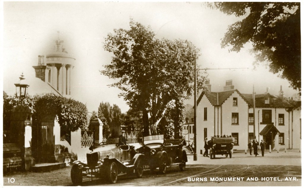 3 The Ayr tram ran north to south from the junction by the Burgh Hall, Prestwick, grid reference NGR NS352,262 to the Burns Hotel, Alloway (tracks at the south end of the route are visible on some postcards of that location including the one below).