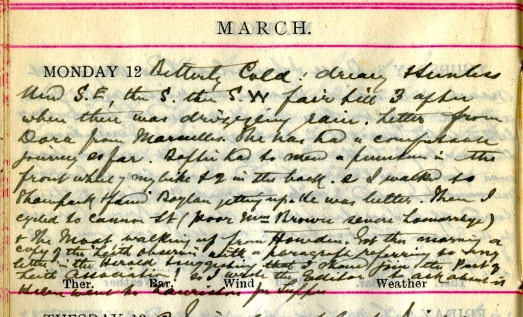 Bitterly cold : dreary + sunless . Wind S.E, then S. + then S.W. Fair till 3 after which there was drizzling rain. Letter from Dora from Marseilles.1 She has had a comfortable journey so far. Baptie2 had to mend a puncture in the front wheel of my bike so I walked to Shawpark + found Boylan3 getting up. He was better. Then I cycled to Cannon Street (poor Mrs Brown4 severe haemorrhage) + the Moat walking up from Howden.5 Got this morning a copy of the Leith Observer with a paragraph referring to my letter in the Herald6 + suggesting that I should join the Port of Leith Association! So I wrote the Editor to ask about it. Helen7 went to Lauriston8 for supper.