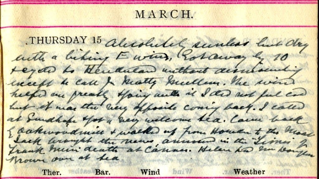 Absolutely sunless but dry with a biting E. wind. Got away by 10 + cycled to Henderland1 without dismounting except to call for Matty Mullins.2 The wind helped me greatly + going with it I did not feel cold but it was the very opposite coming back. I called at Sundhope3 + got a very welcome tea. Came back by Oakwoodmill4 + walked up from Howden to the Moat.5 Jack6 brought the news announced in the Times of Frank Muir’s death at Cannes.7 Helen8 had Mrs Douglas Brown9 at tea.