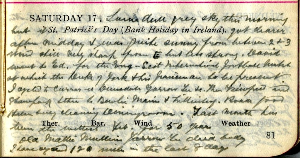 Same dull grey sky this morning but it got clearer after midday + was quite sunny Fromm between 2 + 3. Wind still very sharp from E. but less strong. David1 went to Ed. for the Eng.-Scot. International football match2 at which the Duke of York + his fiancé are to be present.3 I cycled to Curror Street, Dunsdale, Yarrow Terrace +c. Then Viewfield + Shawpark + then to Bewlie Mains4 + Lilliesleaf. Roads good. Helen5 busy cleaning Diningroom. Last month has been the wettest Feb. for 50 years. Old Mattie Mullins, Yarrow Terrace died today.6 I have cycled 120 miles in the last 8 days. I have cycled 120 miles in the last 8 days.