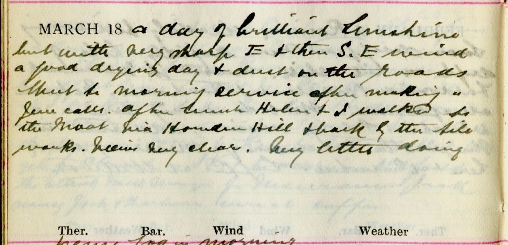 A day of brilliant sunshine but with very sharp E. + then S.E. wind. A good drying day + dust on the roads. Went to morning service after making a few calls. After lunch Helen1 + I walked to the Moat via Howden Hill2 + back by the tile works.3 Views very clear. Very little doing.