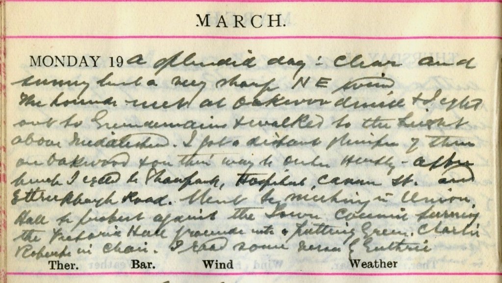 A splendid day : clear + sunny but a very sharp N.E. wind. The hounds met at Oakwoodmill + I cycled out to Greendemains1 + walked to the height above Middlestead.2 I got a distant glimpse of them on [?] Oakwood + on their way to Outer Huntly3– after lunch I cycled to Shawpark, Hospital, Cannon Street and Ettrickhaugh Road. Went to meeting in Union Hall to protest against the Town Council turning the Victoria Hall grounds into a Putting Green. Charles Roberts4 in chair. I read some verses by Guthrie.5