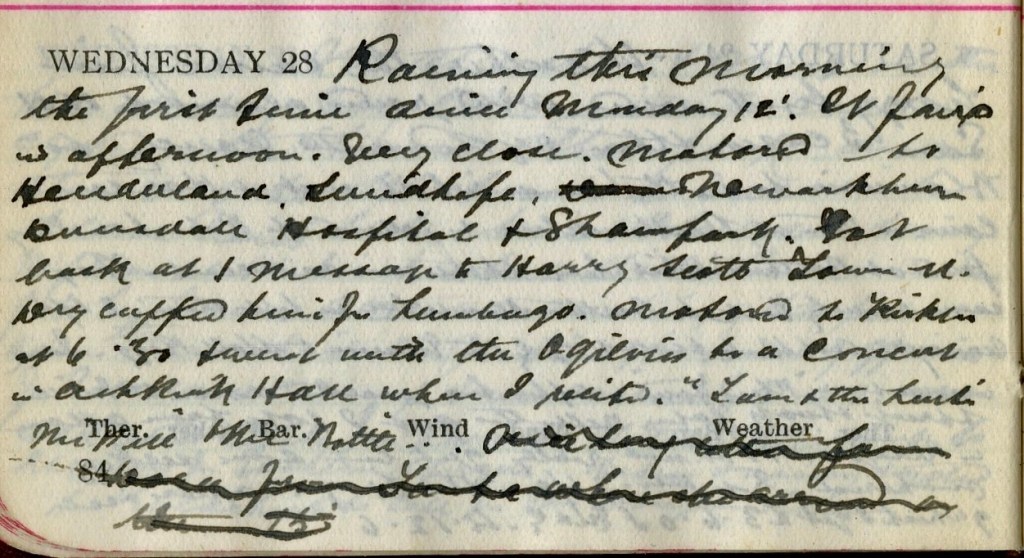 Raining this morning, the first time since Monday 12th. It faired in afternoon. Very close. Motored to Henderland, Sundhope, Newarkburn, Dunsdale, Hospital + Shawpark. Got back at 1. Message to Harry Scott, Tower Street.1 Dry cupped him for lumbago. Motored to Kirklea at 6.30 + went with the Ogilvies2 to a concert in Ashkirk Hall where I recited ”Tam + the Leechs”3, “The Pill + the Bottle”4… [section of text deleted].