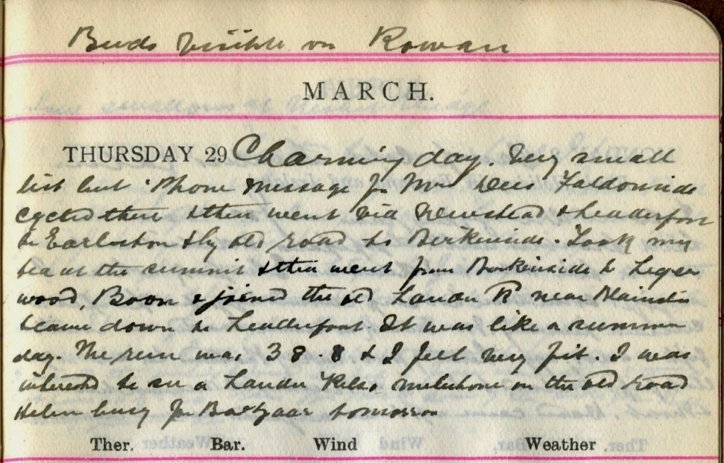 Charming day. Very small list but ‘Phone message for Mrs Dees, Faldonside.1 Cycled there + then went to Newstead + Leaderfoot to Earlston + by old road to Birkenside.2 Took my tea at the summit + then went from Birkenside to Legerwood, Boon + joined the old Lauder road near Blainslie + came down to Leaderfoot.3 It was like a summer day. The run was 38.8 + I felt very fit. I was interested to see a Lauder Kelso milestone on the old road. Helen4 busy for Bazaar tomorrow.