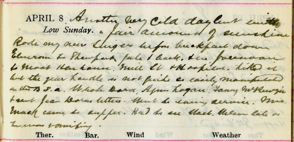Another very cold day but with a fair amount of sunshine. Rode my new Singer1 before breakfast down Elmrow to Shawpark2 gate + back, + in forenoon to Moat3, Henhouse4, Mill Street + Hospital. Liked it but the gear handle is not quite as easily manipulated as the B.S.A.5 Wrote Dora6, Agnes Logan7, Fanny McKenzie8 + sent Jean9 Dora’s letters. Went to evening service. Mrs Mack came10 to supper. Had to see Walt. Wilson11 late on as he was vomiting.