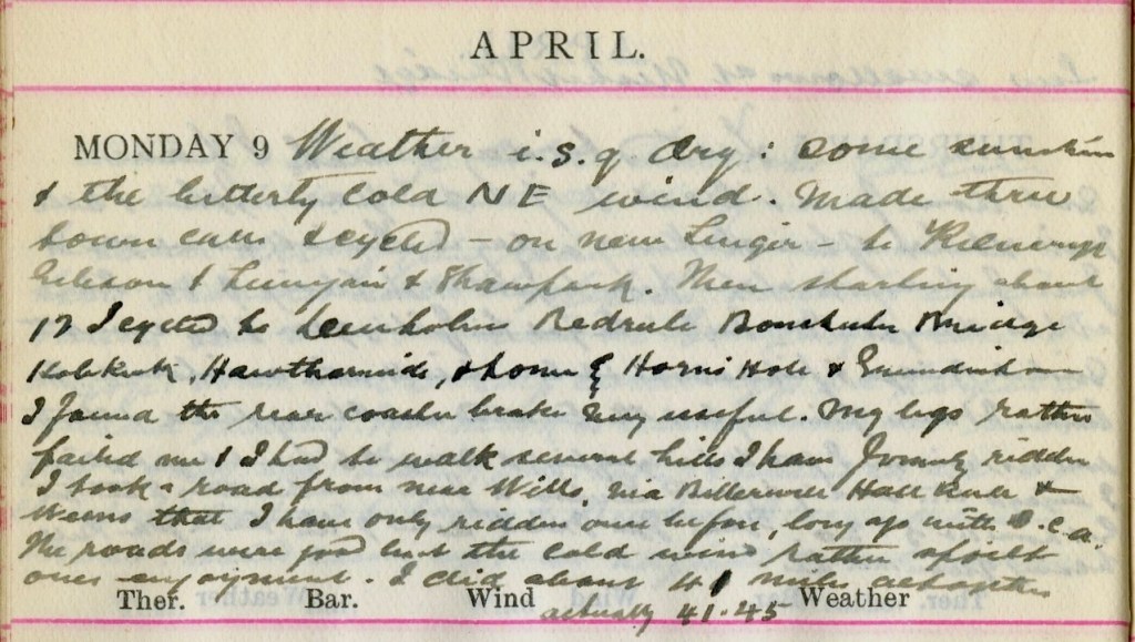 Weather i.s.q.1 dry : some sunshine + the bitterly cold N.E. wind. Made three town calls + cycled – on new Singer2 – to Kirkwynd3, Gibson + Lumgair4 + Shawpark.5 Then, starting about 12 I cycled to Denholm, Bedrule, Bonchester Bridge, Hobkirk, Hawthornside, + home by Horn’s Hole + Grundiston.6 I found the rear coaster brake very useful.7 My legs rather failed me + I had to walk several hills I have formerly ridden. I took a road from near Wills, via Billerwell, Hall Rule + Weens8 that I have only ridden one before, long ago with D.C.A.9 The roads were good but the cold wind rather spoilt ones enjoyment. I did about 41 miles altogether, actually 41.45.10