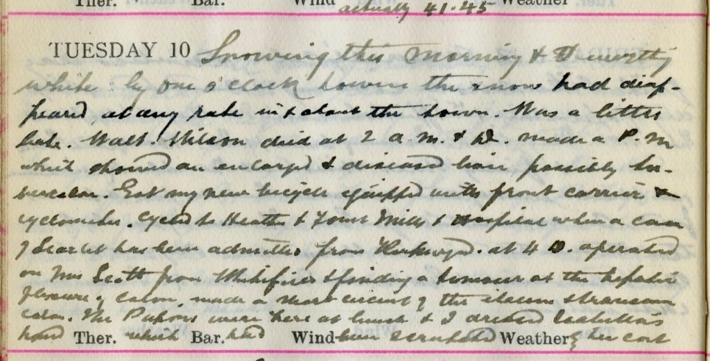Snowing this morning + everything white : by one o’clock the snow had disappeared, at any rate in + about the town. Was a little late [?]. Walt. Wilson1 died at 2 a.m. + D.2 made a p.m. [post mortem] which showed an enlarged + diseased [illegible] possibly tubercular. Got my new bicycle equipped with front carrier + cyclometer.3 Cycled to Heather + Forest Mills4 + Hospital where a case of Scarlet has been admitted from Kirkwynd.5 At 4 D. operated on Mrs Scott from Whitfield6 + finding a tumour at the hepatic flexure of colon, made a short circuit of the ileum + transverse colon. The Patons7 were here at lunch + I dressed Isabella’s hand which had been scratched by her cat.