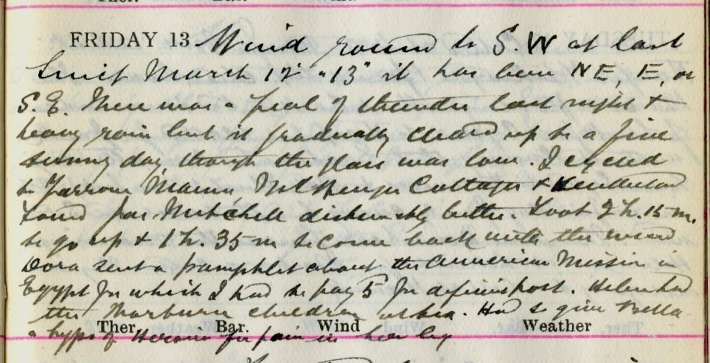 Wind round to S.W. at last. Since March 12th– 13th it has been N.E., E, or S.E. There was a peal of thunder last night + heavy rain but it gradually cleared up to a fine sunny day, though the glass [barometer] was low. I cycled to Yarrow Manse, Mountbenger Cottages + Henderland. Found James Mitchell1 distinctly better. Took 2h. 15m to go up + 1h. 35m to come back with the wind. Dora2 sent a pamphlet about the American Mission in Egypt for which I had to pay 5d for deficient post. Helen3 had the Thorburn children4 at tea. Had to give Bella5 a hypo of Heroin for pain in her leg.