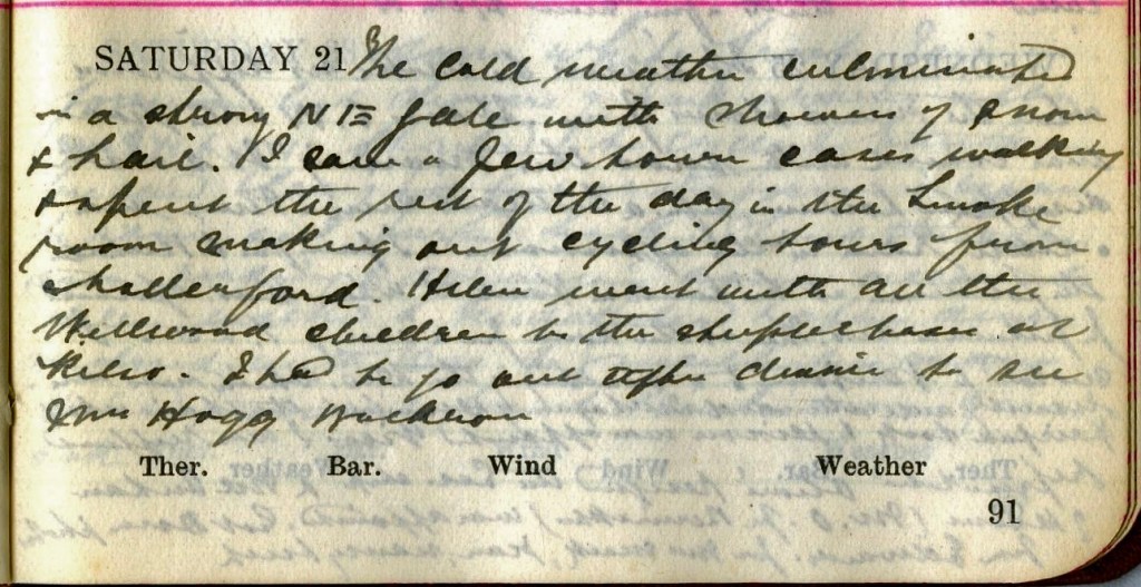 The cold weather culminated in a strong N.E. gale with showers of snow + hail. I saw a few town cases walking + spent the rest of the day in the Smoke room making out cycling tours from Chollerford.1 Helen2 went with all the Wellwood children3 to the steeple chase at Kelso. I had to go out after dinner to see Mrs Hogg, Backrow.4