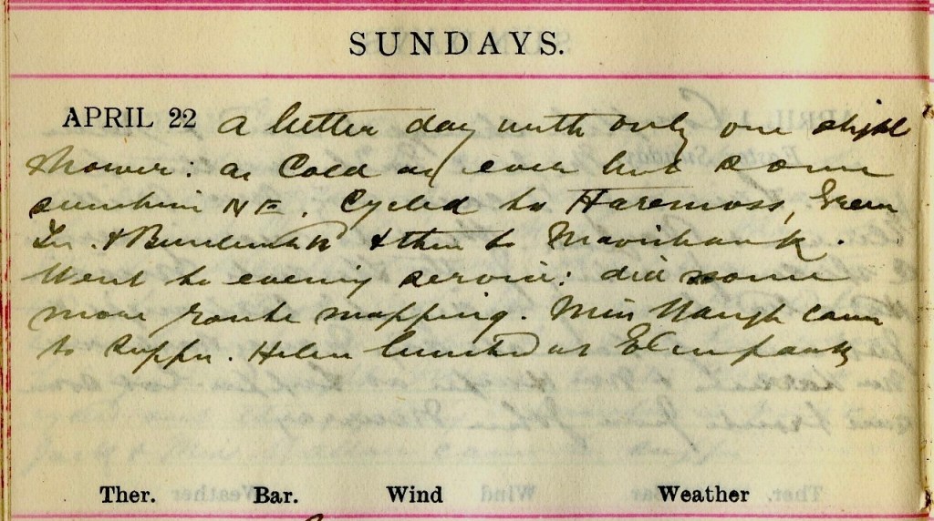 A better day with only one slight shower : as cold as ever but some sunshine N.E. Cycled to Haremoss, Green Terrace + Buccleuch Road + then to Mavisbank. Went to evening service : did some more route mapping. Miss Waugh1 came to supper. Helen2 lunched at Elmpark.3