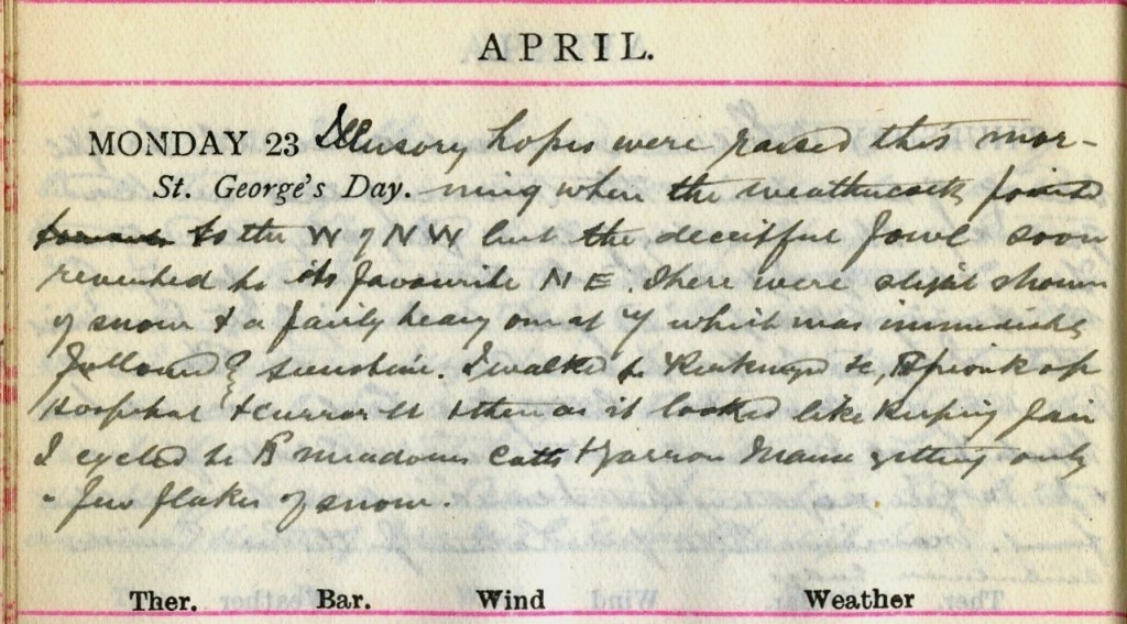 Illusory hopes were raised this morning when the weathercock pointed towards to the W. of N.W. but the deceitful fowl soon rounded to its favourite N.E. There were slight showers of snow + a fairly heavy one at 7 which was immediately followed by sunshine. I walked to Kirkwynd +c Spion Kop1, Hospital + Curror Street + then, as it looked like keeping fair, I cycled to Broadmeadows Cottage2 + Yarrow Manse3 getting only a few flakes of snow.