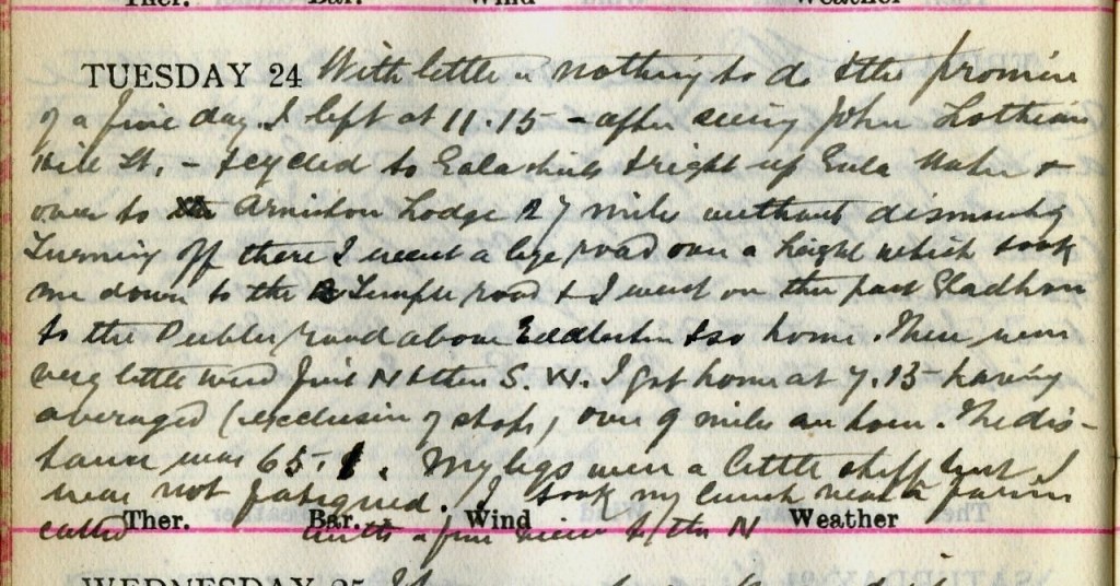 With little or nothing to do + the promise of a fine day I left at 11.15 – after seeing John Lothian, Hill Street1 – + cycled to Galashiels + right up Gala Water + over to Arniston Lodge2 27 miles without dismounting. Turning off there I went a bye road over a height which took me down to the Temple road + I went on then past Gladhouse to the Peebles road above Eddleston3 + so home. There was very little wind first N. + then S. W. I got home at 7.15 having averaged (exclusive of stops) over 9 miles an hour. The distance was 65.1. My legs were a little stiff but I was not fatigued. I took my lunch near a farm called [blank space] with a fine view to the N.4