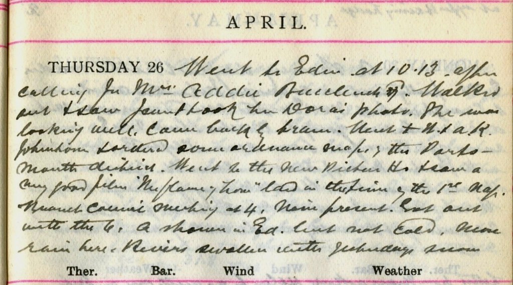 Went to Edinburgh at 10.13, after calling for Mrs Addie, Buccleuch Road.1 Walked out + saw Jean2 + took her Dora’s photo.3 She was looking well. Came back by tram. Went to H. & A. K. Johnstone4 + ordered some ordnance maps of the Portsmouth district.5 Went to the new Picture House + saw a very good film ‘The Flame of ?” laid in the time of the 1st [illegible].6 Branch Council meeting at 4.7 Nine present. Got out with the 6. A shower in Edinburgh but not cold. More rain here. Rivers swollen with yesterday’s snow.