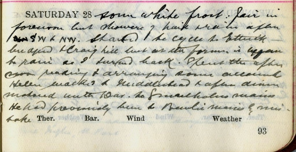Some white frost : fair in forenoon but showers of hail after, S.W. + N.W. Started to cycle to Ettrickbridgend + Craighill1 but at the former it began to rain so I turned back. Spent the afternoon reading + arranging some accounts. Helen2 walked to Middlestead3 + after dinner motored with Dav.4 to Smailholm Mains. He had previously been to Bewlie Mains by mistake.5