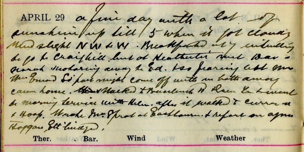 A fine day with a lot of sunshine up till 5 when it got cloudy. Wind slight N.W. to W. Breakfasted at 7 intending to go to Craighill1 but at Heatherlie Met Dav. + Norah2 motoring away to Edinburgh + so, fearing about Mrs William Emond, South Port3 might come off with both of us away, came home. Walked to Buccleuch Road + Green Terrace + went to morning service with Helen.4 After it walked to Curror Street + Hospital. Wrote Mrs Sprot5 at Eastbourne, + report on Agnes Huggan, Ettrickbridgend6.
