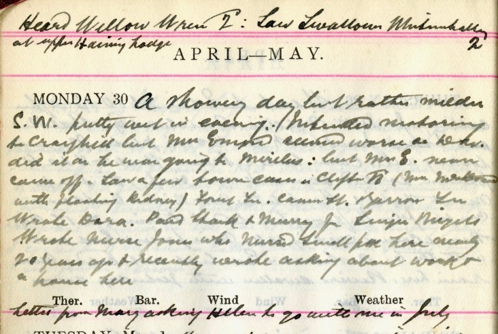 A showery day but rather milder S.W. pretty wet in evening. Intended motoring to Craighill2 but Mrs Emond seemed worse so Dav.3 did it as he was going to Mirelees4 : but Mrs E never came off.5 Saw a few town cases in Clifton Road (Mrs Macdonald) with floating kidney6, Forest Terrace, Cannon Street + Yarrow Terrace. Wrote Dora7. Paid Stark + Murray for Singer Bicycle.8 Wrote Nurse Jones who nursed Small pox here nearly 20 years ago + recently wrote asking about work + a house here.9