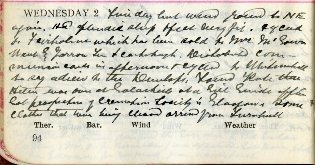 Fine day but wind round to N.E. again. Had splendid sleep + feel very fit. Cycled to Fairholme1 which has been sold to Mrs McGown.2 Went by Yarrow Terrace + Earlsheugh.3 Distributed Communion cards in afternoon + cycled to Whitmuirhall to say adieu to the Dunlops.4 Found Kate5 there. Helen6 was over at Galashiels at a Girl Guide [illegible]. Got prospectus of Cremation Society in Glasgow.7 Some clothes that were being cleaned arrived from Turnbull.8