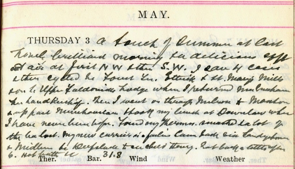 A touch of summer at last. Lovely brilliant morning + a delicious soft [text deleted] air at first N.W. + then S.W. I saw 4 cases + then cycled to Forest Terrace, Ettrick + St Mary’s Mills + on to Upper Faldonside Lodge where I returned Mrs Graham1 her handkerchief. Then I went on through Melrose to Maxton + up past Muirhouselaw + took my lunch at Downlaw2 where I have never been before. Found my Thermos smashed + a lot of the tea lost.3 My new carrier4 is a failure [?]. Came back by Sandystones + Midlem to Deepslade5 to see a child Henry.6 Got back a little after 6. Hot bath. M 31.8.