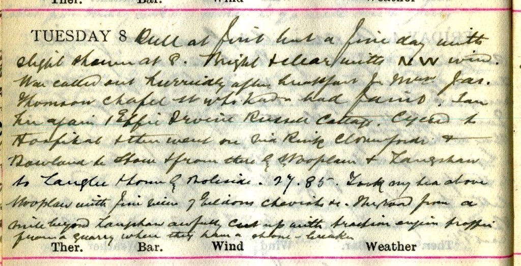 Dull at first but a fine day with slight shower at 8. Bright + clear N.W. wind. Was called out hurriedly after breakfast for Mrs Jas. Thomson1, Chapel Street, who had had pains. Saw her again. Effie Devine, Russell Cottage.2 Cycled to Hospital + then went on over Rink, Clovenfords + Bowland to Stow + from there by Wooplaw + Langshaw + home by Boleside. 27.85.3 Took my tea above Wooplaw with fine views of Eildons, Cheviot +c. The road from a mile beyond Langshaw awfully cut up with traction engine traffic from a quarry where they have a stone-breaker.4