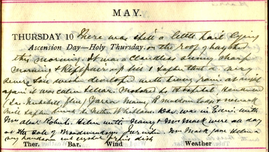 There was still a little hail lying on the roof of hayshed this morning. It was a cloudless, sunny, sharp morning + kept fair up till 1 + after that a very severe Sou Wester developed with heavy rain. At night again it was calm + clear. Motored to Hospital, Henderland (Jas. Mitchell, flue1), Yarrow Mains, Broadmeadows Lodge + Newark Mill + after lunch Nether Whitlaw. Dav.2 was in Edinburgh with Mrs Alexr Roberts3. Helen4 with Nancy5 + Mrs Mack6 were all day at the sale of Broadmeadows furniture.7 Mrs Mack gave Helen a very handsome cut crystal fruit dish.