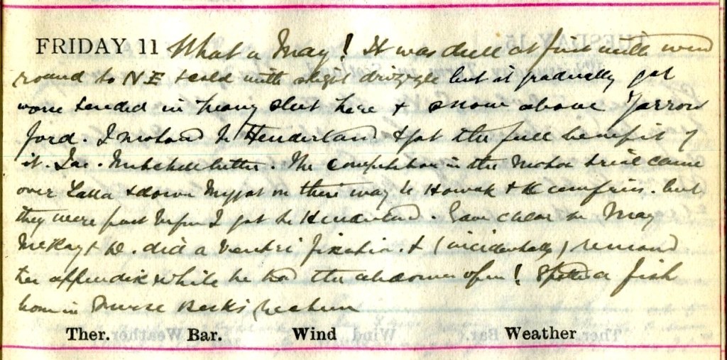 What a May! It was dull at first with wind round to N.E. + cold with slight drizzle but it gradually got worse + ended in heavy sleet here + snow above Yarrowford. I motored to Henderland + got the full benefit of it. Jas. Mitchell better.1 The competition in the motor trial2 came over Falla + down Moffat on their way to Hawick + Dumfries, but they were past before I got to Henderland. Gave Chlor[oform] to May McKay3 + D.4 did a [illegible] fixation + (accidentally) removed her appendix while he had the abdomen open! [illegible text] Nurse Beck’s5 rectum.