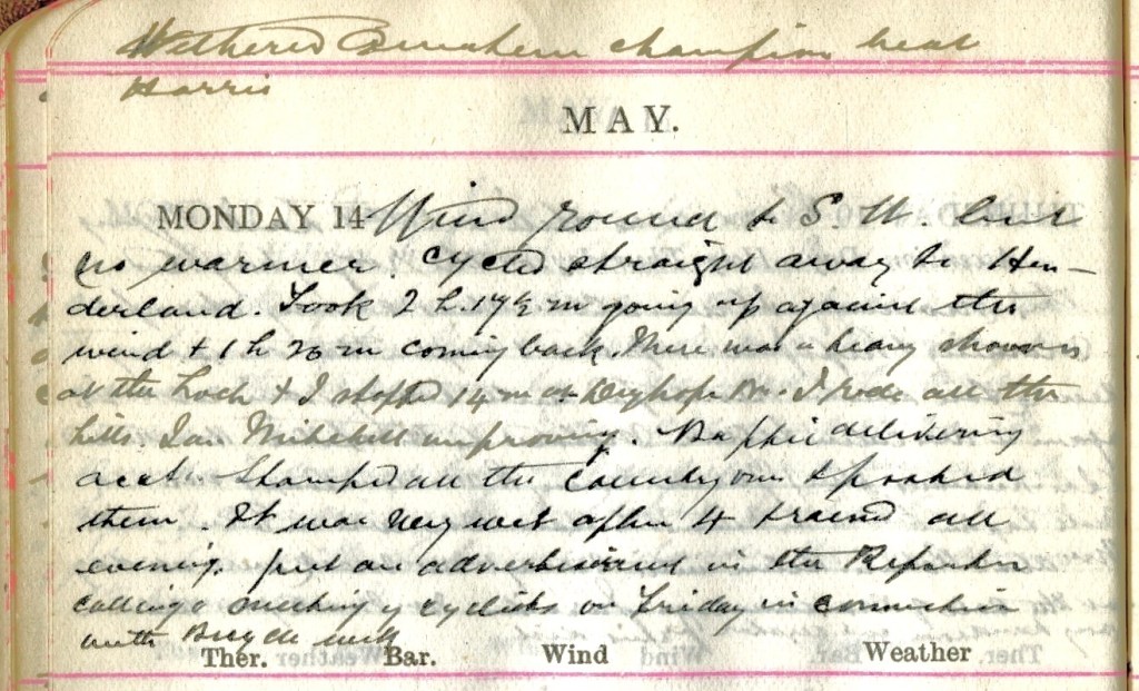 Wind round to S.W. but no warmer. Cycled straight away to Henderland.4 Took 2h 17½ in going up against the wind + 1h 20 coming back. There was a heavy shower at the Loch + I stopped 14m at Dryhope Bridge5. I rode all the hills. Saw Mitchell improving. Baptie6 delivering accounts. Stamped all the County ones + posted them.7 It was very wet after 4 + rained all evening. Put an advertisement in the Reporter8 calling a meeting of cyclists on Friday in connection with Bicycle Week.9