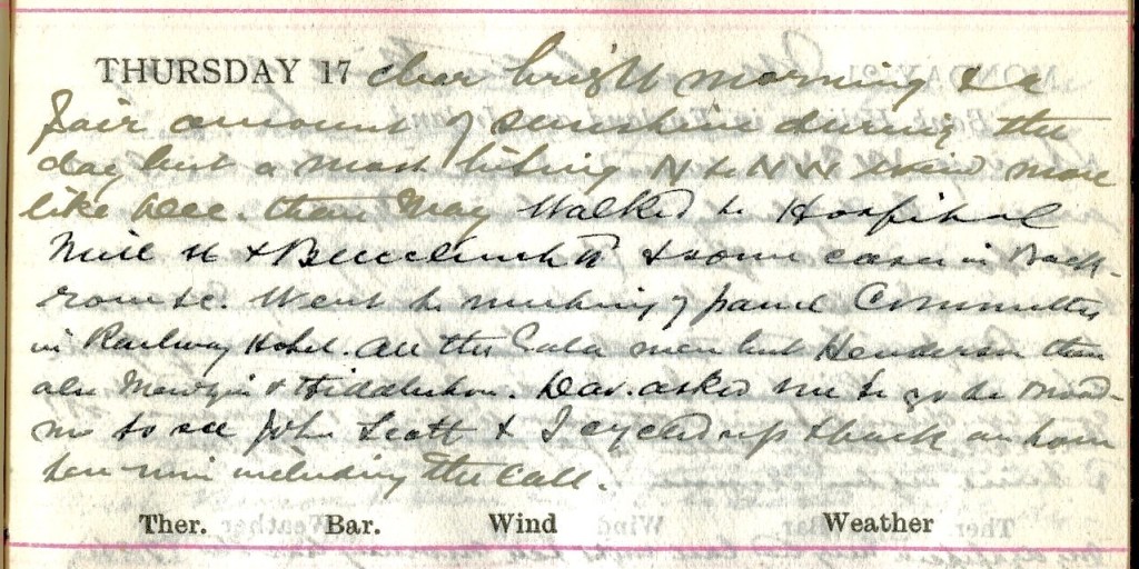 Clear bright morning + a fair amount of sunshine during the day but a most biting N. to N.W. wind more like December than May. Walked to Hospital, Mill Street + Buccleuch Road + some cases in Backrow +c. Went to meeting of Panel Committee1 in Railway Hotel.2 All the Gala men but Henderson there3, also Menzies4 + Hiddleston.5 Dav.6 asked me to go to Broadmeadows to see John Scott7 + I cycled up + back an hour ten minutes including the call.