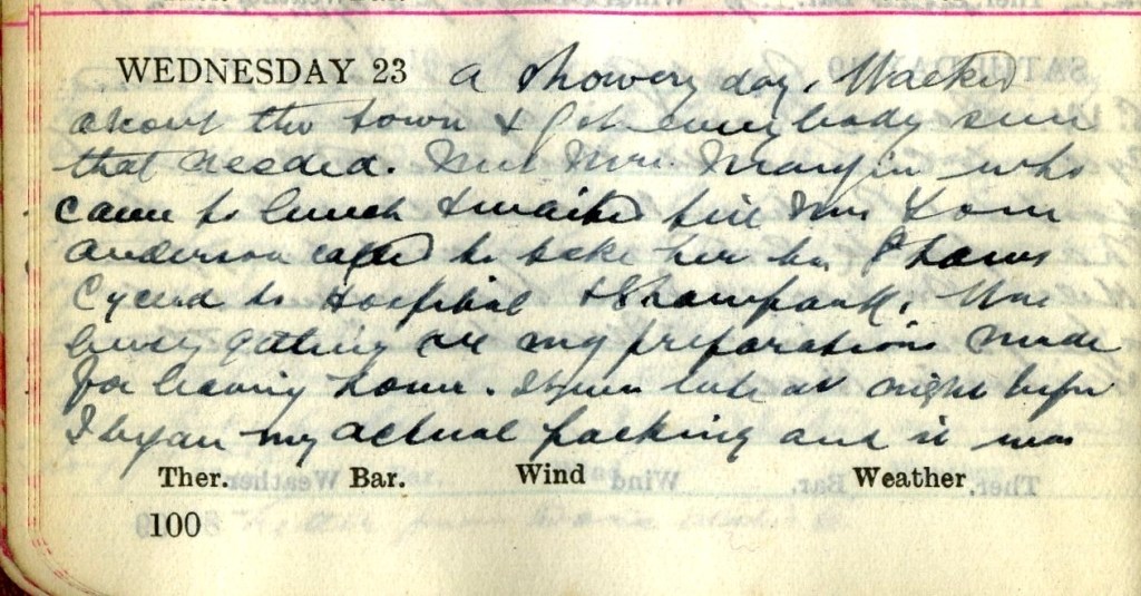 A showery day. Walked about the town + got everybody seen that needed. Met Mrs [illegible]1 who came to lunch + waited till Mrs Tom Anderson2 called to take her to Shaws. Cycled to Hospital + Shawpark. Was busy getting my preparations made for leaving home. It was late at night before I began my actual packing3 and it was [continued as entry for 24 May 1923].