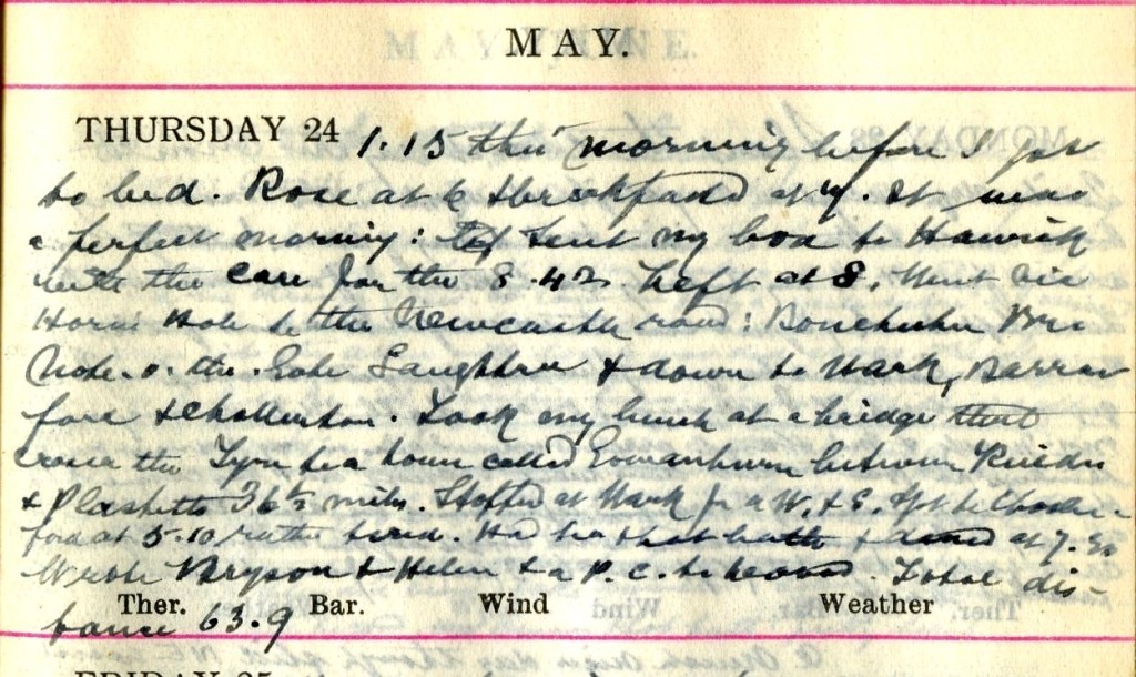 … 1.15 this morning1 before I got to bed. Rose at 6 + breakfasted at 7. It was a perfect morning : [word deleted] sent my box to Hawick with the case for the 8.42. Left at 8. Went via Horn’s Hole [sic] to the Newcastle road : Bonchester Bridge, Note o the Gate + Saughtree2 + down to Wark, Barrasford + Chollerton. Took my lunch at a bridge that crosses the Tyne to a town called Gowanburn3 between Kielder + Plashetts 36½ miles. Stopped at Wark for a W. + S. + got to Chollerford at 5.10 rather tired.4 Had tea + hot bath + dined at 7.50. Wrote Bryson5 + Helen6 + a P.C. [post card] to David7 [?]. Total distance 63.9.