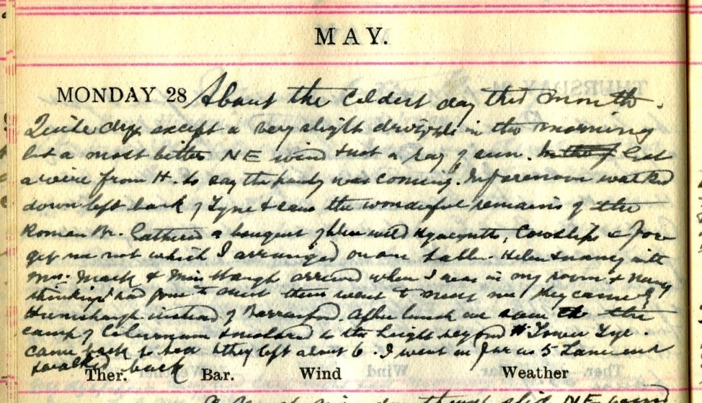 About the coldest day this month. Quite dry except a very slight drizzle in the morning + a most bitter N.E. wind + not a ray of sun. [word deleted] Got a wire from H.1 to say the party was coming. In forenoon walked down left bank of Tyne + saw the wonderful remains of the Roman Bridge.2 Gathered a bouquet of blue wild Hyacinths, Cowslips + Forget-Me-Not which I arranged on our table. Helen + Nancy3 with Mrs Mack4 + Miss Waugh5 arrived when I was in my room + Nancy, thinking I had gone to meet them, came to meet me. They came by Humshaugh instead of Barrasford.6 After lunch we saw the camp of Cilurnum7 + motored to the height beyond [illegible words].8 Came back to tea + they left about 6. I went as far as 5 Lane End9 + walked back.