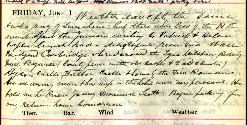 Weather exactly the same + not a ray of sunshine : but there was less of the N.E. wind. Spent the forenoon writing to Patrick1 + Helen2 + after lunch had a delightful run via Wall, Bridgend, Corbridge, where I crossed the Tyne, Dilston, Riding Mill, Bywell (lovely place with old castle + 2 old churches), Aydon Castle, Halton Castle3 + home by the Via Romana.4 An old army man + his wife in the hotel were very pleasant. He told me knew Fanny Maxwell Scott.5 Began packing for my return home tomorrow.