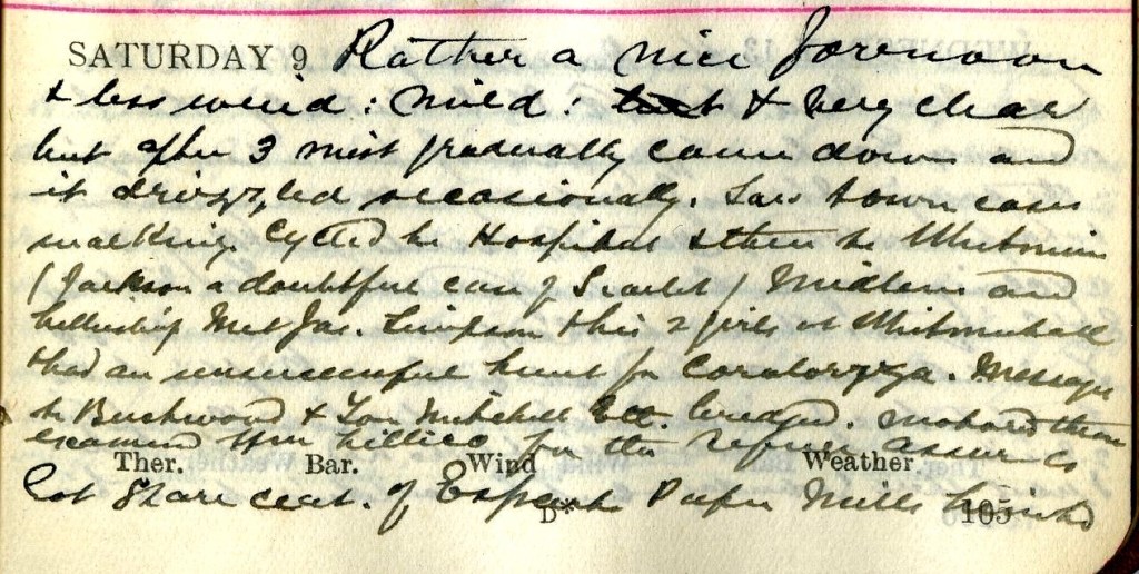 Rather a nice forenoon + less wind : mild : + very clear but after 3 mist gradually came down and it drizzled occasionally. Saw town cases walking. Cycled to Hospital + then to Whitmuir (Jackson1 a doubtful case of Scarlet), Midlem and Lilliesleaf. Met James Simpson + his 2 girls at Whitmuirhall.2 Had an unsuccessful hunt for Coralorgza [?]. Messages to Beechwood + Tom Mitchell, Ettrickbridgend.3 Motored there [and] examined William Lillico4 for the [illegible] Insurance Co. Got share certificate of Esparto Paper Mills5 [illegible].