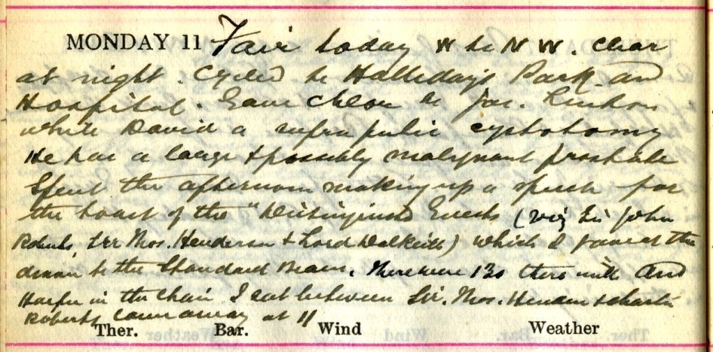 Fair today W. to N.W. Clear at night. Cycled to Halliday’s Park and Hospital. Gave chlor[oform] to Jas. Renton1 while Dav.2 [did] a Supra pubic cystostomy. He has a large + possibly malignant Prostate. Spent the afternoon making up a speech for the toast of the “Distinguished Guests”3 (viz. Sir John Roberts4, Sir Thomas Henderson5 + Lord Dalkeith6, 7) which I gave at the dinner to the Standard Bearer. There were 130 there with And. Harper8 in the Chair. I sat between Sir Thomas Henderson + Charlie Roberts.9 Came away at 11.