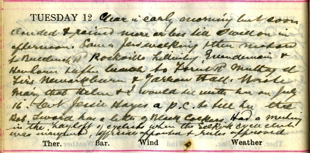 Clear in early morning but soon clouded + rained more or less till ? well on in afternoon. Saw a few walking + then motored to Buccleuch Road, Rockville, Lilliesleaf, Greendemain1 + Henhouse + after lunch to Forest Road, Muthag Street, Firs, Newarkburn + Yarrow Hall. Wrote Mary2 that Helen3 + I would be with her on July 16.4 Sent Jessie Hayes5 P.C. [post card] to tell her that Rob Sword6 has a litter of Black Cockers. Had a meeting in the hayloft of cyclists when the Selkirk Cycle Club was inaugurated, officials appointed + rules approved.