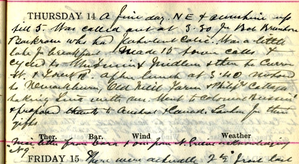 A fine day. N.E. [wind] + sunshine up till 5. Was called out at 3.30 for Bob Brunton, Backrow1 who had flatulent colic. Was a little late for breakfast. Made 15 town calls + cycled to Whitmuir + Midlem + then to Curror Street + Forest Road. After lunch at 3.40 motored to Newarkburn, Old Mill Farm + Philipgh Cottages, taking Tina with me. Went to Colonial Bussin’ + proposed thanks to Austral. + Canad. Souters for their gifts.2