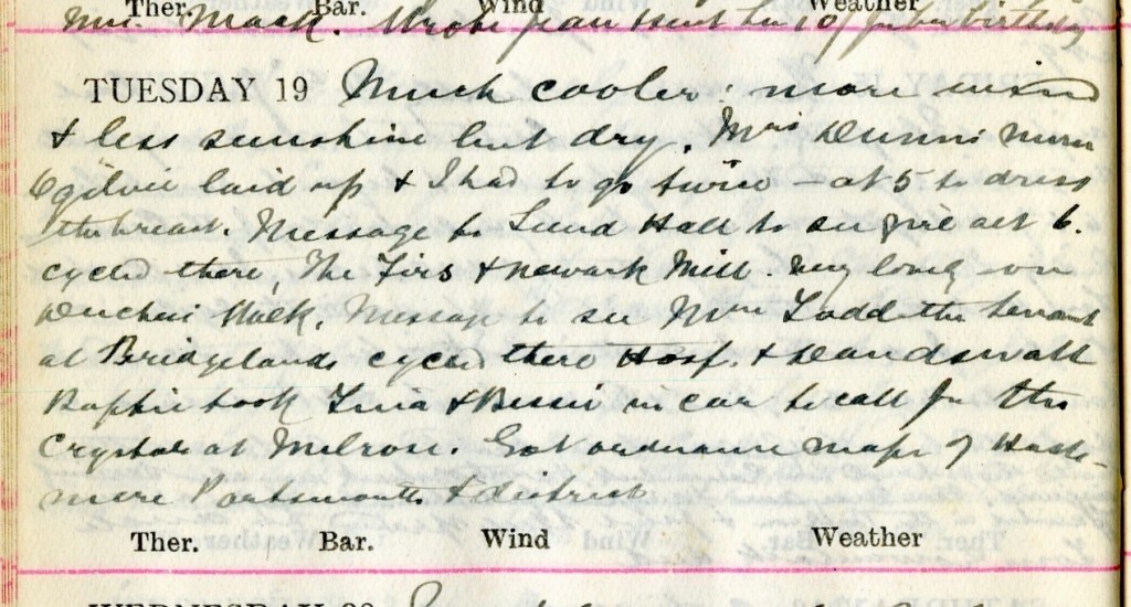 Much cooler : more wind + less sunshine but dry. Mrs Dunn’s1 nurse Ogilvie2 laid up + I had to go twice – at 5 to dress the breast. Message to Sund. Hall3 to see girl aet 6.4 Cycled there, The Firs5 + Newark Mill.6 Very lovely on Duchess’s Walk.7 Message to see Mrs Todd the servant at Bridgelands.8 Cycled there, Hospital + Dandswall.9 Baptie10 took Tina11 + Bessie12 in car to call for the Crystals at Melrose.13 Got Ordnance maps of Haslemere, Portsmouth + District14