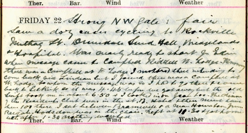 Strong N.W. gale : fair. Saw a dozen cases cycling to Rockville, Muthag Street, Dunsdale, Sund. Hall, Bridgelands + Hospital. Was nearly ready to start for Edinburgh when message came to Campbell1, Riddell West Lodge.2 Knowing there was a Campbell at East Lodge3 I motored there intending to come back via Lindean4 but I found there was a Campbell at West Lodge to whom the message was so I had to go there + come back to Selkirk so it was 4.45 before we got away but the old Swift5 took me in about 6.50 + I looked in on Jean6 too. The dinner of the Residents’ Club7 was in the N. Brit. Hotel8 + there must have been 100 there. I sat between Bramwell9 + a man Howatson10 from Reigate. Hodsdon11 was in the Chair. Left at 11.30 + got home [illegible] after 1.30. Nothing wanted.