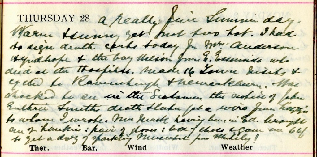 A really fine summer day. Warm + sunny yet not too hot. I had to sign death certs today for Mrs Anderson, Hyndhope1 + the boy Wilson from E Essenside who died at the Hospital.2 Made 16 Town visits + cycled to Ravensheugh + Newarkburn. Was shocked to see in The Scotsman the notice of John Guthrie Smith’s death + later got a wire from Lizzie whom I wrote.3 Mrs Mack4 having been in Edinburgh brought me a hankie : pair of gloves : box of chocs + gave me 66/- to get a dozen of sparkling Muscatel from Whiteley!5