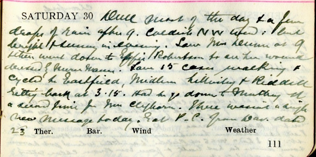 Dull most of the day + a few drops of rain after 9. Coldish N.W. wind : but bright + sunny in evening. Saw Mrs Dunn1 at 9 + then went down to Effie Robertson2 to see her wound dressed by Nurse Mann.3 Saw 15 cases walking + cycled to Eastfield, Midlem, Lilliesleaf + Riddell getting back at 3.15. Had to go down to Muthag Street a second time for Mrs Cleghorn.4 There wasn’t a single new message today. Got a P.C. [postcard] from Dav.5 dated 23rd.