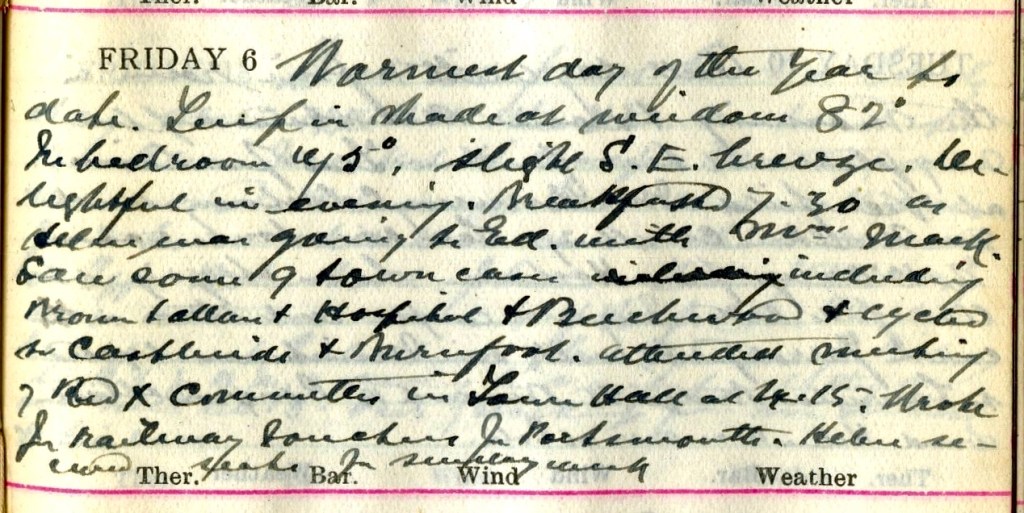Warmest day of the year to date. Temp. in shade of window 82°. In bedroom up 5°. Slight S.E. breeze. Delightful in evening. Breakfasted 7.30 as Helen1 was going to Edinburgh with Mrs Mack.2 Saw some 9 town cases including including Brown + Allan3 + Hospital + Beechwood + cycled to Castleside + Burnfoot.4 Attended meeting of Red X [Cross] Committee in Town Hall at 4.14. Wrote for Railway Vouchers for Portsmouth.5 Helen secured seats for Sunday week.6