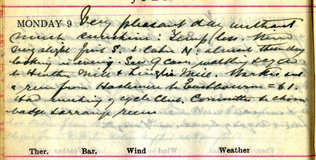 Very pleasant day without much sunshine : Temperature less. Wind very slight, first S. and later N : almost thundery-looking in evening. Saw 9 cases walking + cycled to Heather Mill + Linglie Mill.1 Worked out a run from Haslemere to Eastbourne = 61 [miles].2 Had meeting of Cycle Club.3 Committee to choose badge + arrange runs.
