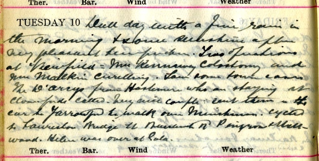 Dull day with a fine rain in the morning+ some sunshine after. Very pleasant temperature. Two operations at Viewfield = Mrs Kennaway1 Colostomy and Mrs Malkin2 Curetting. Saw some town cases. The D’Arcys from Haslemere3 who are staying at Clovenfords called. Very nice couple : sent them in the car to Yarrowford to walk over Minchmoor.4 Cycled to Lauriston, Bridge Street, Buccleuch Road, Pinegrove + Wellwood. Helen5 was over at Gala.