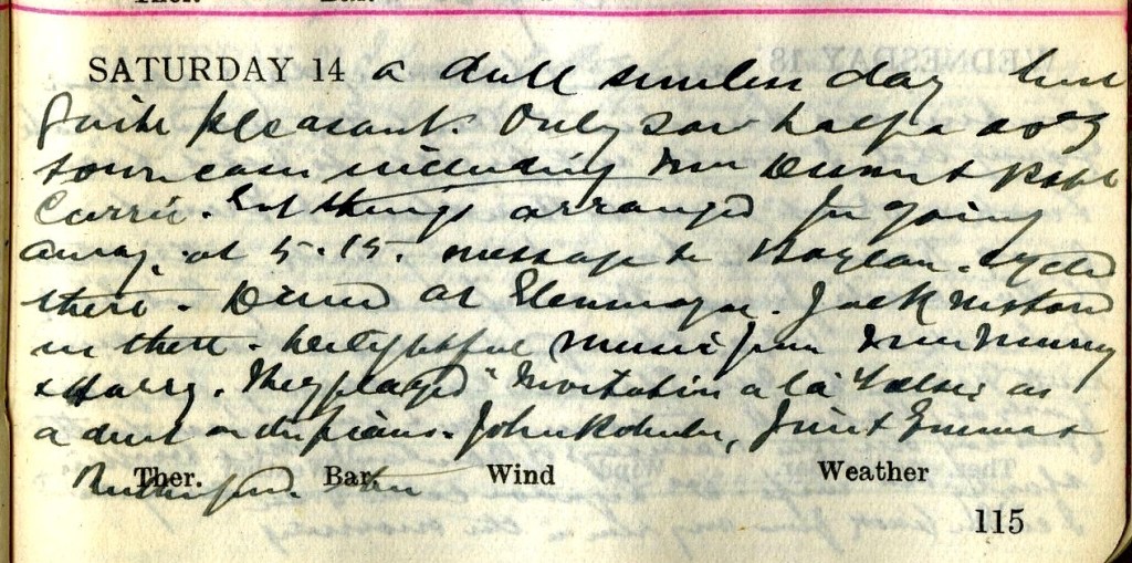 A dull sunless day but quite pleasant. Only saw half a dozen town cases including Mrs Dunn1 + Robert Currie.2 Got things arranged for going away at 5.15. message to Boylan.3 Cycled there. Dined at Glenmayne.4 Jack5 motored us there. Delightful music from Mrs Murray + Harry.6 They played “Invitation a la Valse” as a duet on the piano.7 John Roberts8, Jim + Emma9 + Rutherford10 there.